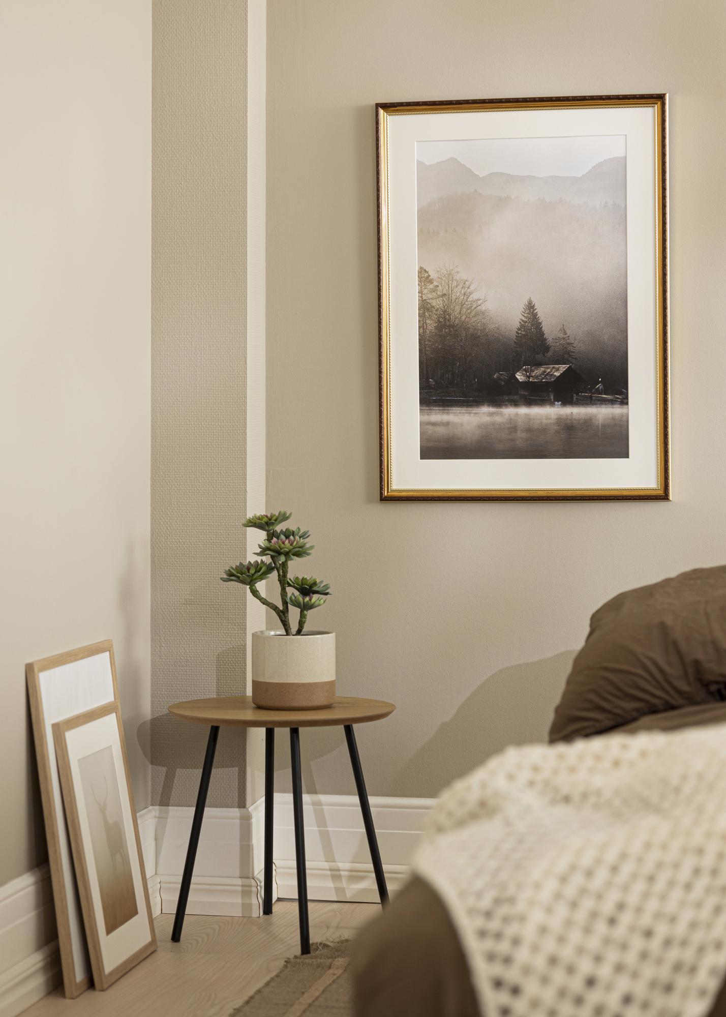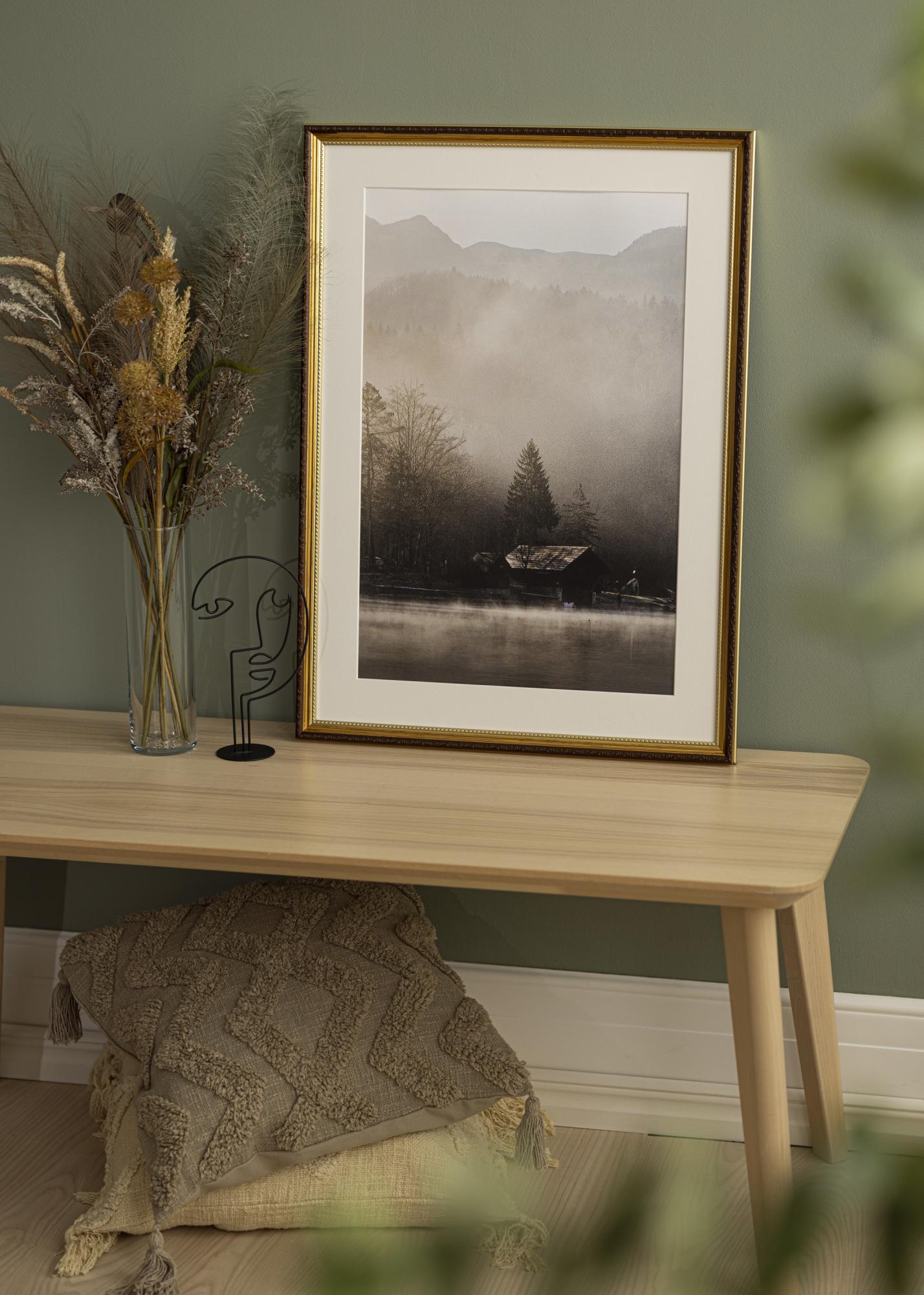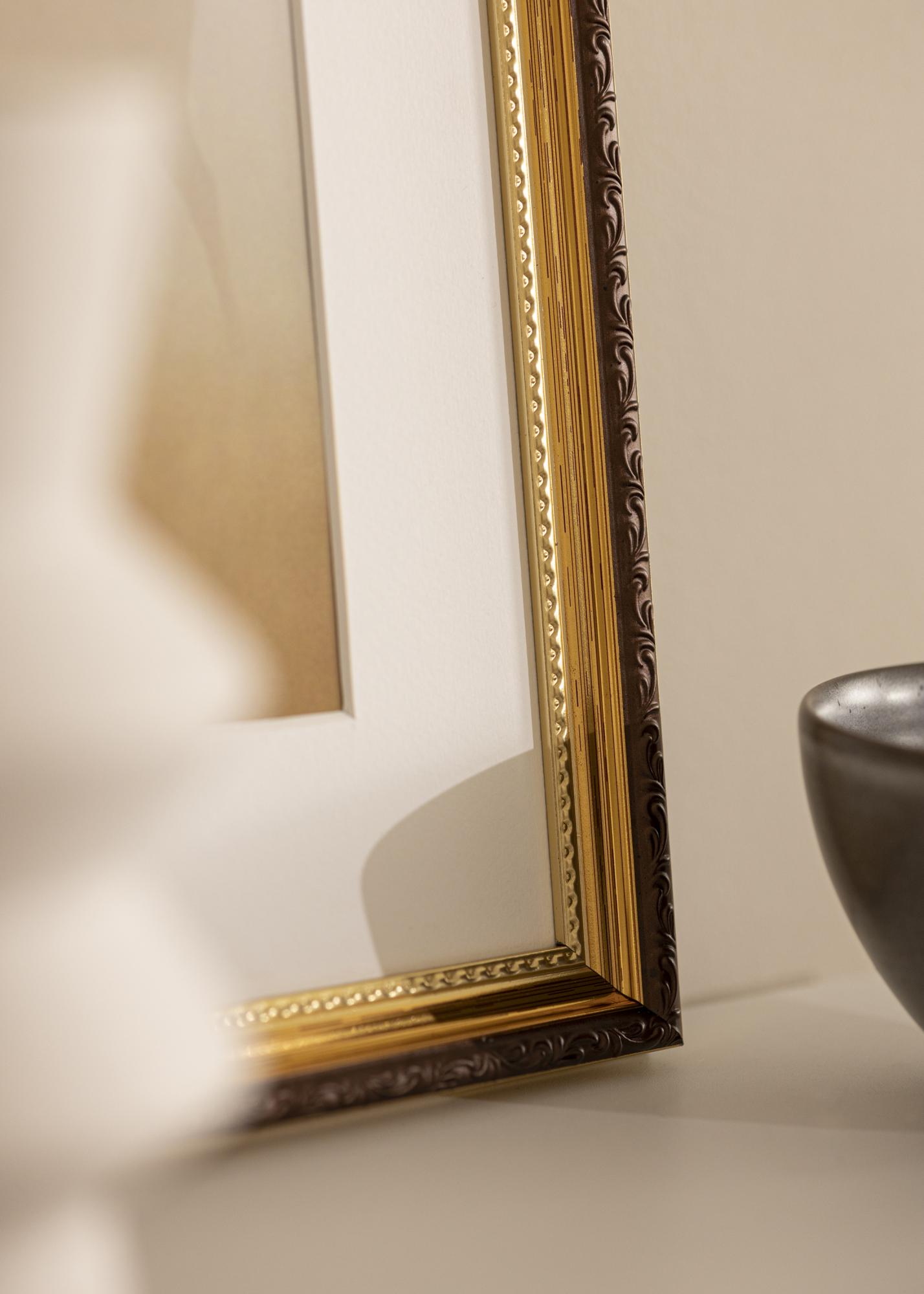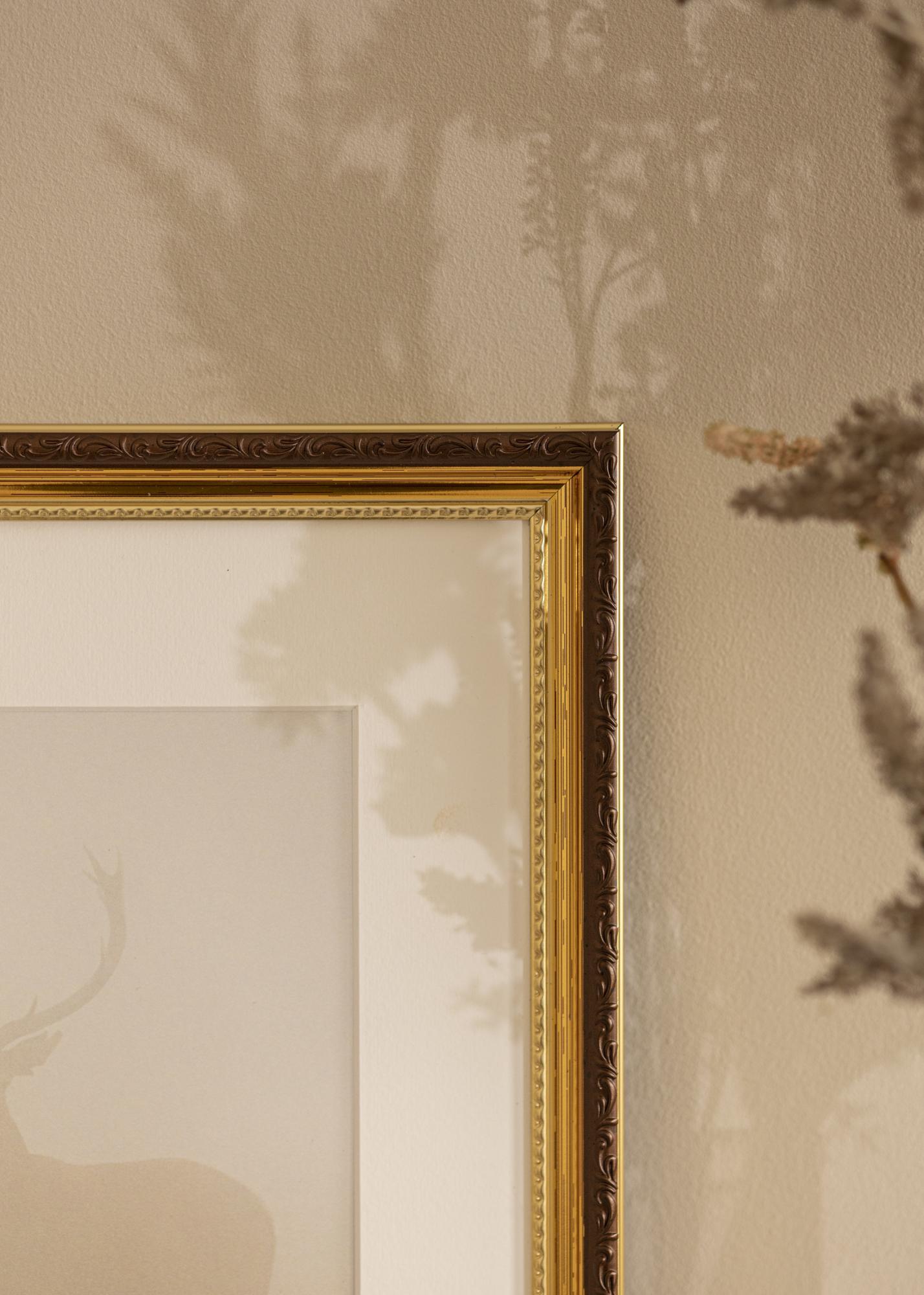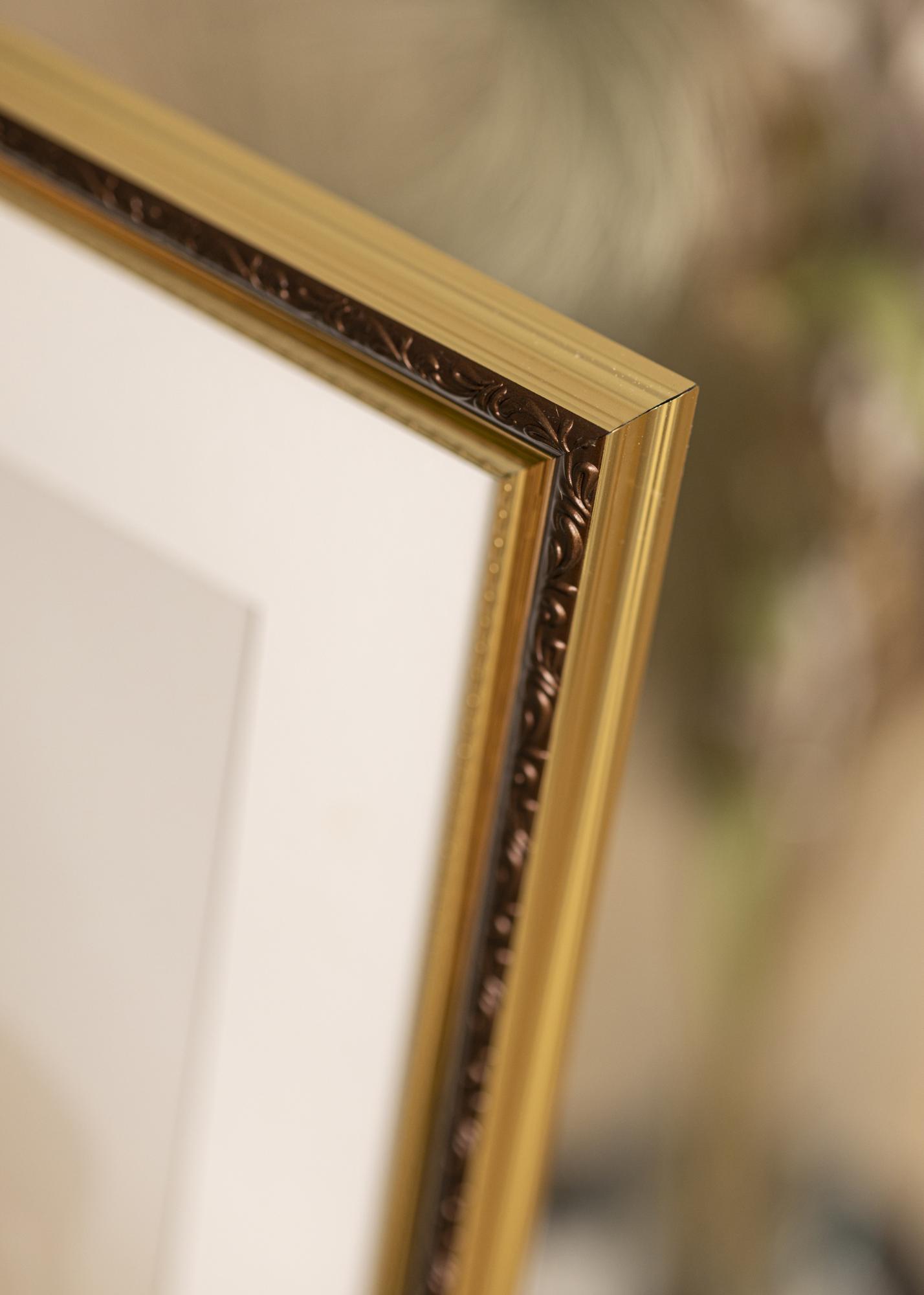 Ein schöner, klassischer Bilderrahmen mit hübschem, antik anmutendem Dekor. Der Bilderrahmen Abisko Acrylglas Gold ist ein ansprechender, goldener Bilderrahmen mit stilvollen Ornamenten, die für einen dekorativen Wandschmuck sorgen. Der Bilderrahmen mit einer Leistenbreite von 25 mm ist in einem glänzenden Goldton gehalten. Die gesamte Leiste entlang verläuft ein reliefartiges Dekor in brauner Farbe. Außerdem ziert ein Muster mit kleinen Bögen am Bildausschnitt den goldfarbenen Teil des Bilderrahmens.