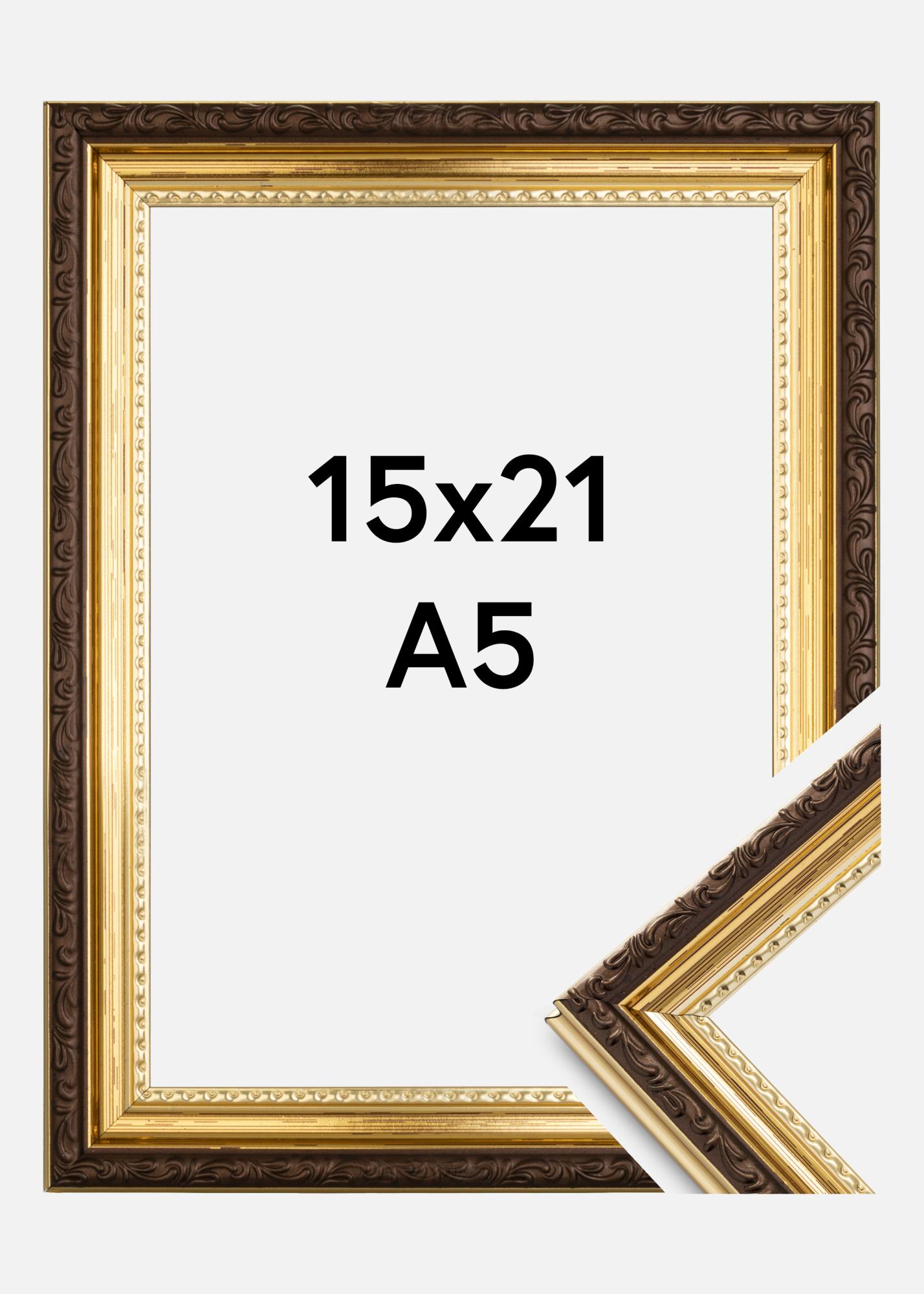 Ein schöner, klassischer Bilderrahmen mit hübschem, antik anmutendem Dekor. Der Bilderrahmen Abisko Acrylglas Gold ist ein ansprechender, goldener Bilderrahmen mit stilvollen Ornamenten, die für einen dekorativen Wandschmuck sorgen. Der Bilderrahmen mit einer Leistenbreite von 25 mm ist in einem glänzenden Goldton gehalten. Die gesamte Leiste entlang verläuft ein reliefartiges Dekor in brauner Farbe. Außerdem ziert ein Muster mit kleinen Bögen am Bildausschnitt den goldfarbenen Teil des Bilderrahmens. Der passende Rahmen für Bilder im DIN A5-Format betont die Schönheit des Bildes und verleiht ihm eine stilvolle Umrahmung.