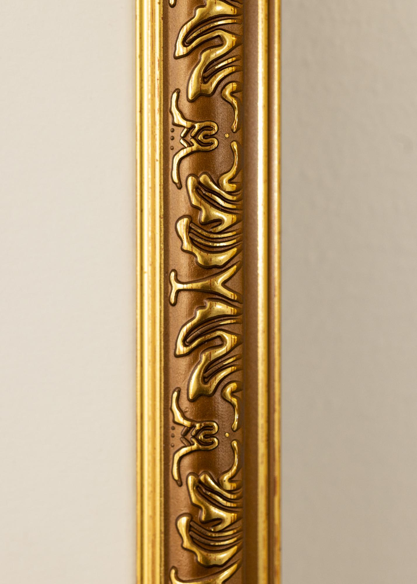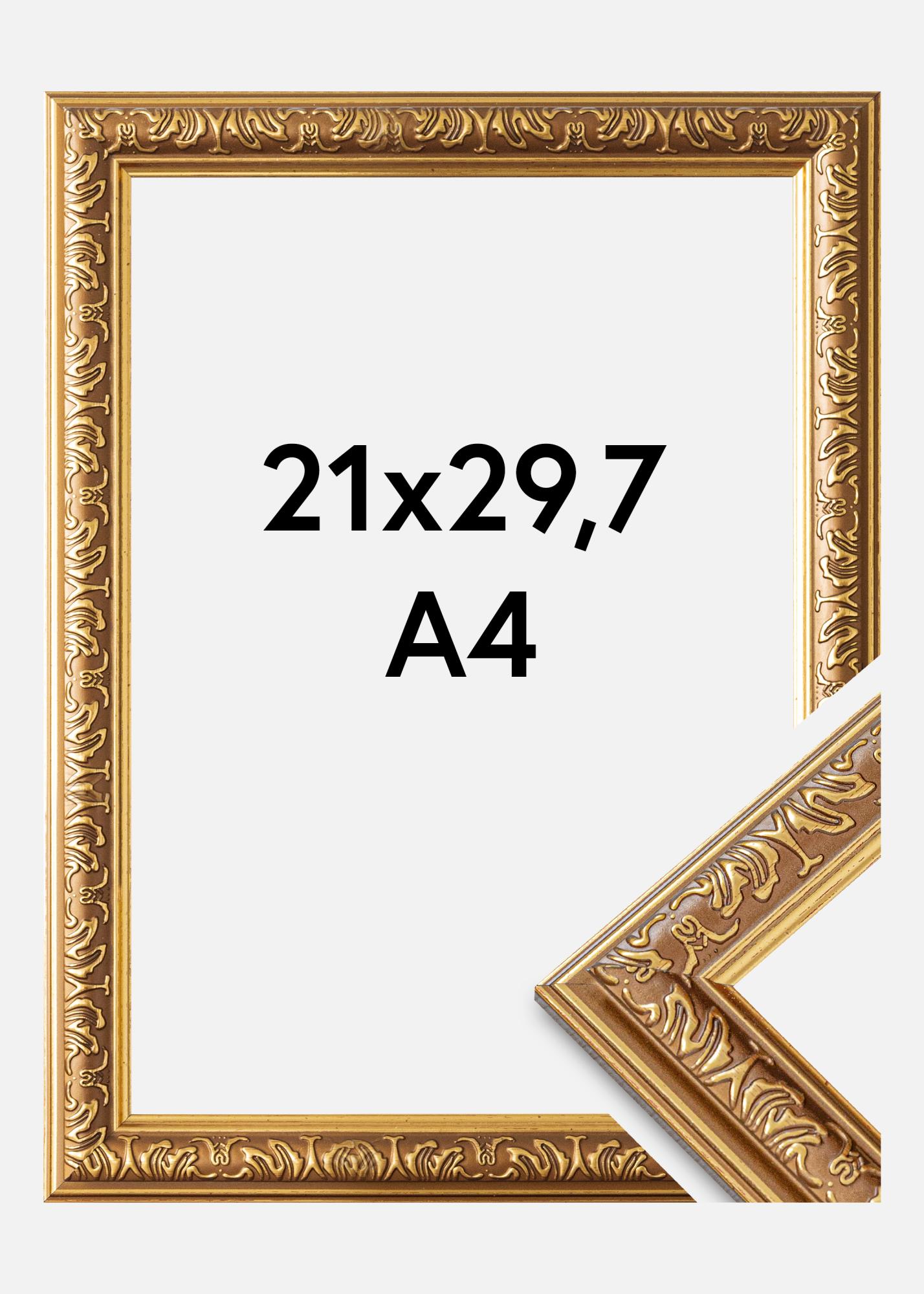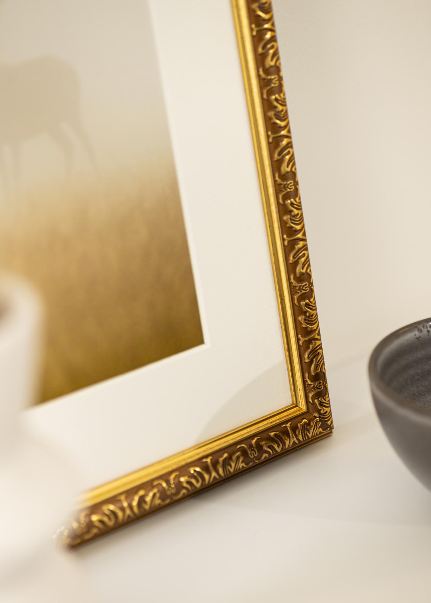 Dieser Fotorahmen in der Größe 21x29,7 cm (A4) ist eine perfekte Kombination aus klassischer Eleganz und moderner Funktionalität. Mit seinem luxuriösen Goldfinish und dekorativen, verzierten Details verleiht er jedem Kunstwerk oder Foto einen Hauch von Raffinesse. Die filigranen Muster entlang der Innenkante des Rahmens schaffen ein traditionelles und zeitloses Gefühl, wodurch er ideal für sowohl klassische als auch elegante Einrichtungsstile ist.