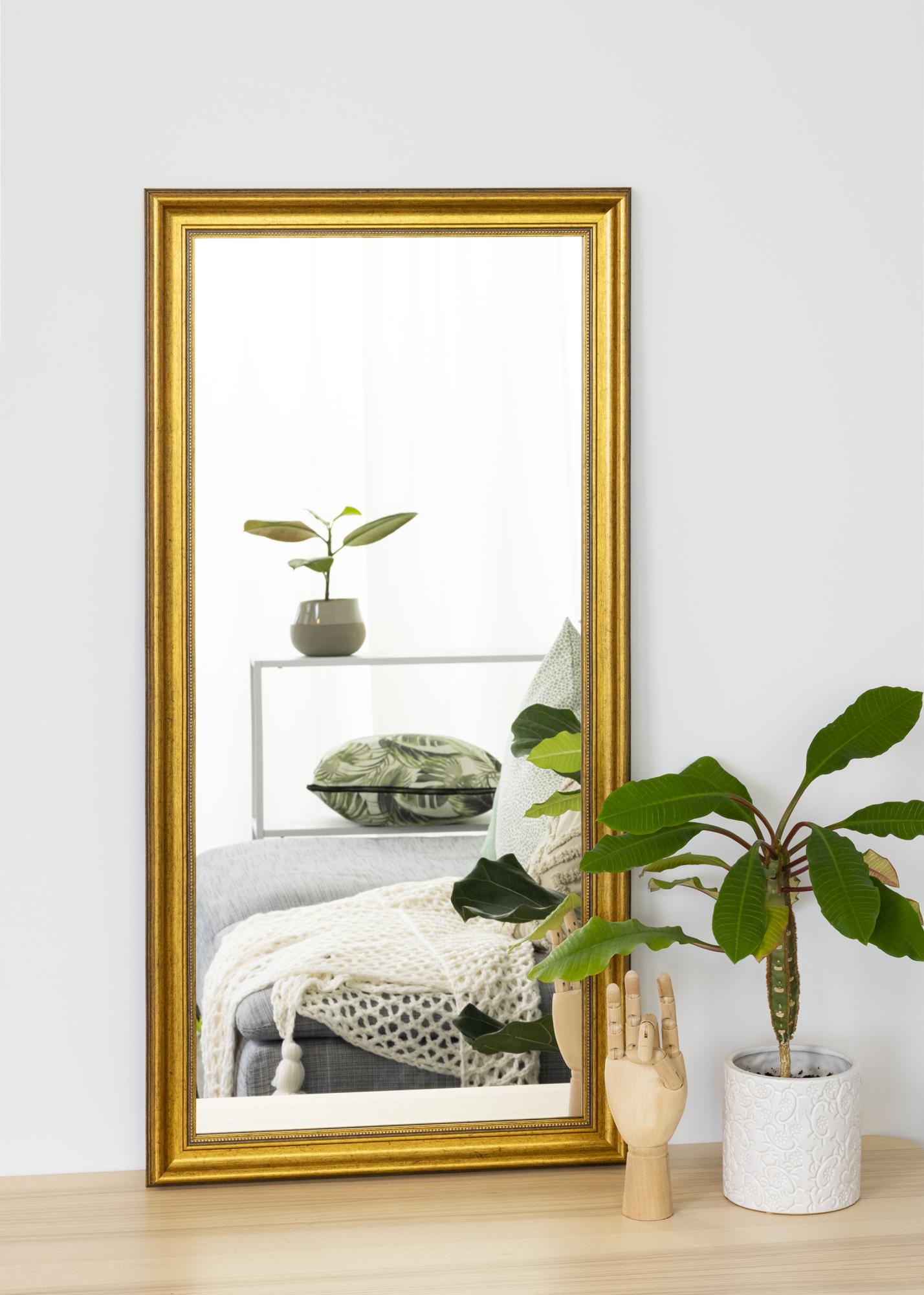 Dieser schöne Rechteck-Spiegel zeichnet sich durch seinen klassischen goldfarbenen Rahmen aus. Der Spiegel strahlt Wärme aus, wirkt dabei doch stilvoll und elegant. Er eignet sich hervorragend als Wanddekoration in nahezu jedem Raum.